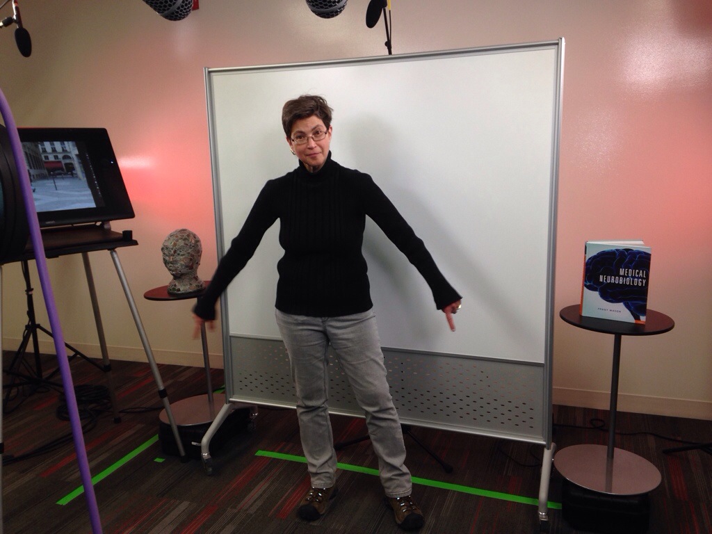 In the early days of filming Understanding the Brain, the set was fairly simple. I wore a microphone and wrote on the wall (a white-board wall). The camera operators, Ryan and Andy, used green tape to mark out an area that measured about 9 x 5 feet (3 x 1.5 m), within which I was free to roam. Ah, the freedom! Memories of care-free days.