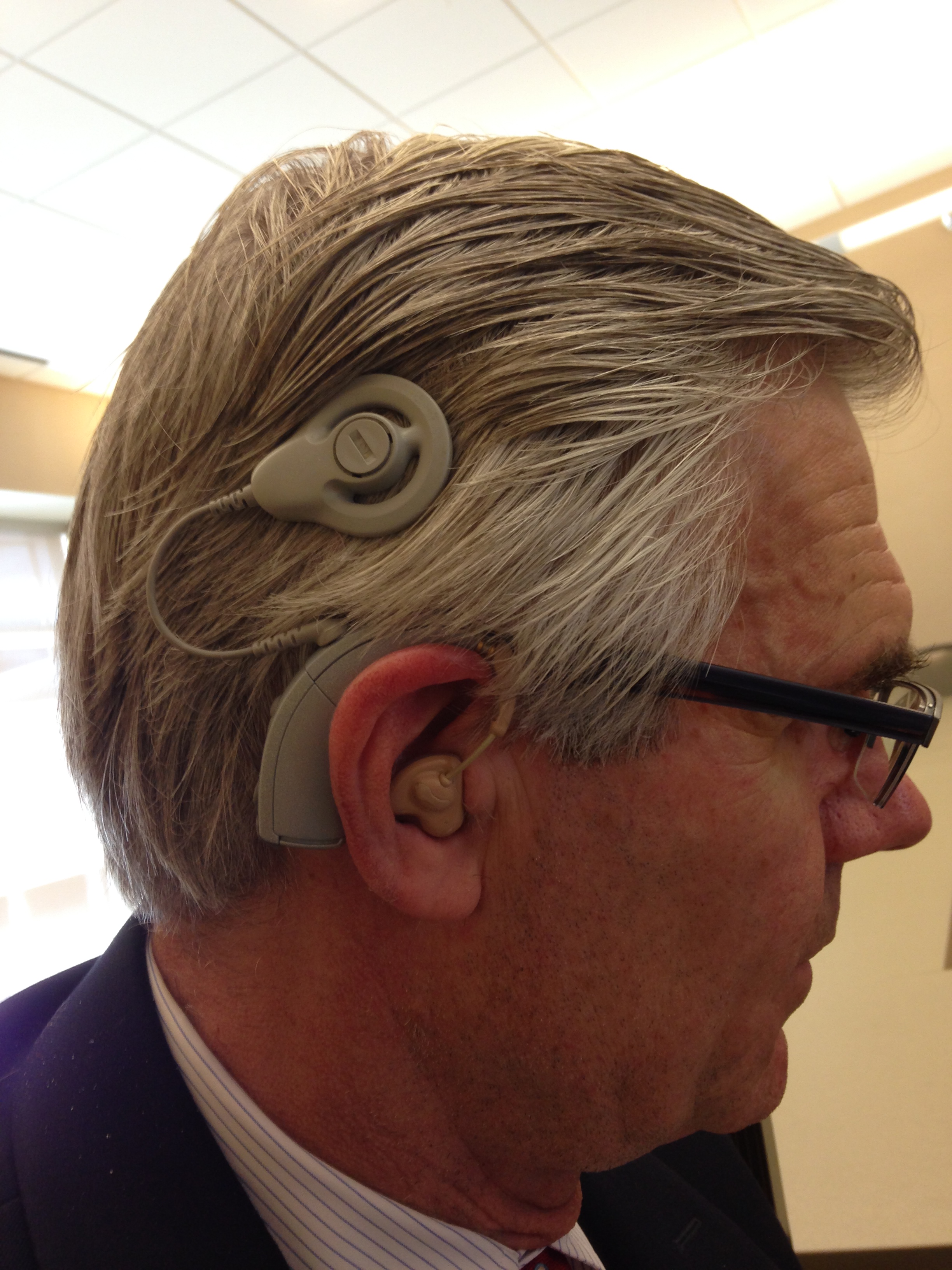 From the side, you can see Tom’s cochlear implant (top disk), audio receiver (behind his ear) and traditional hearing aid (in his ear).